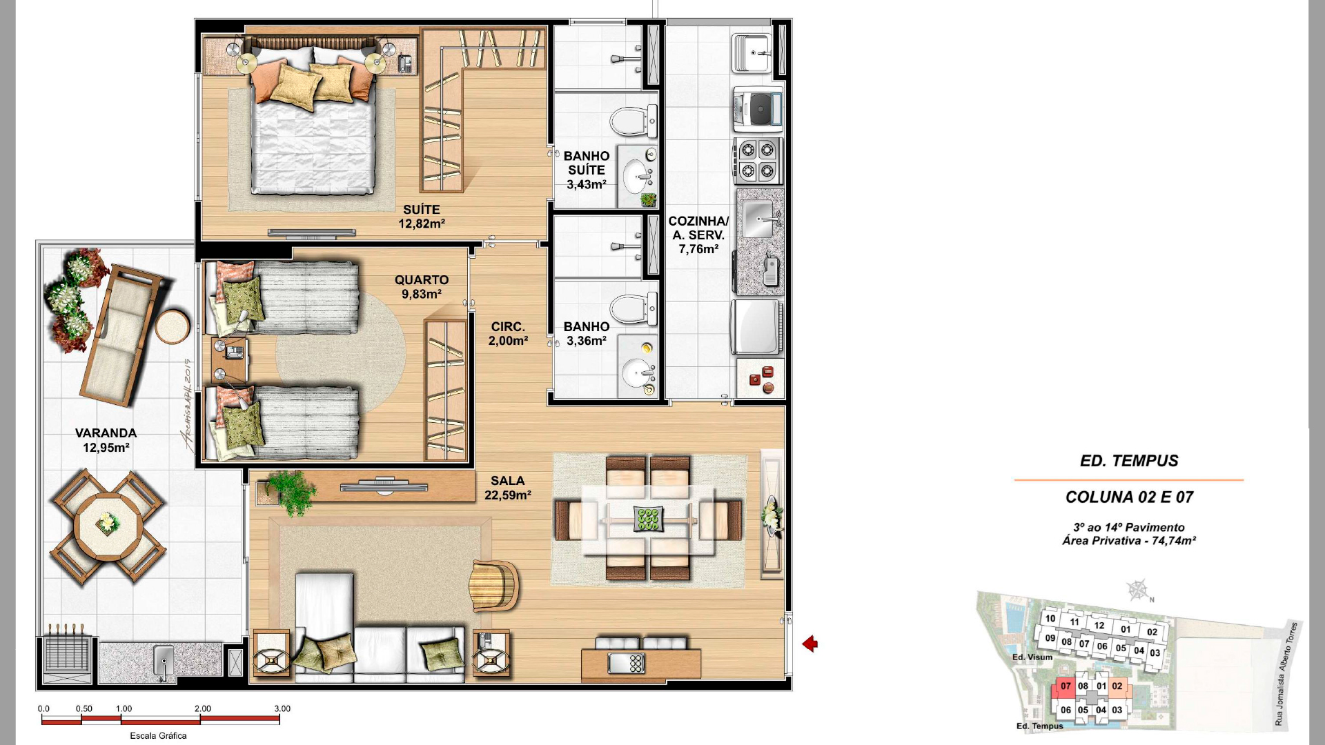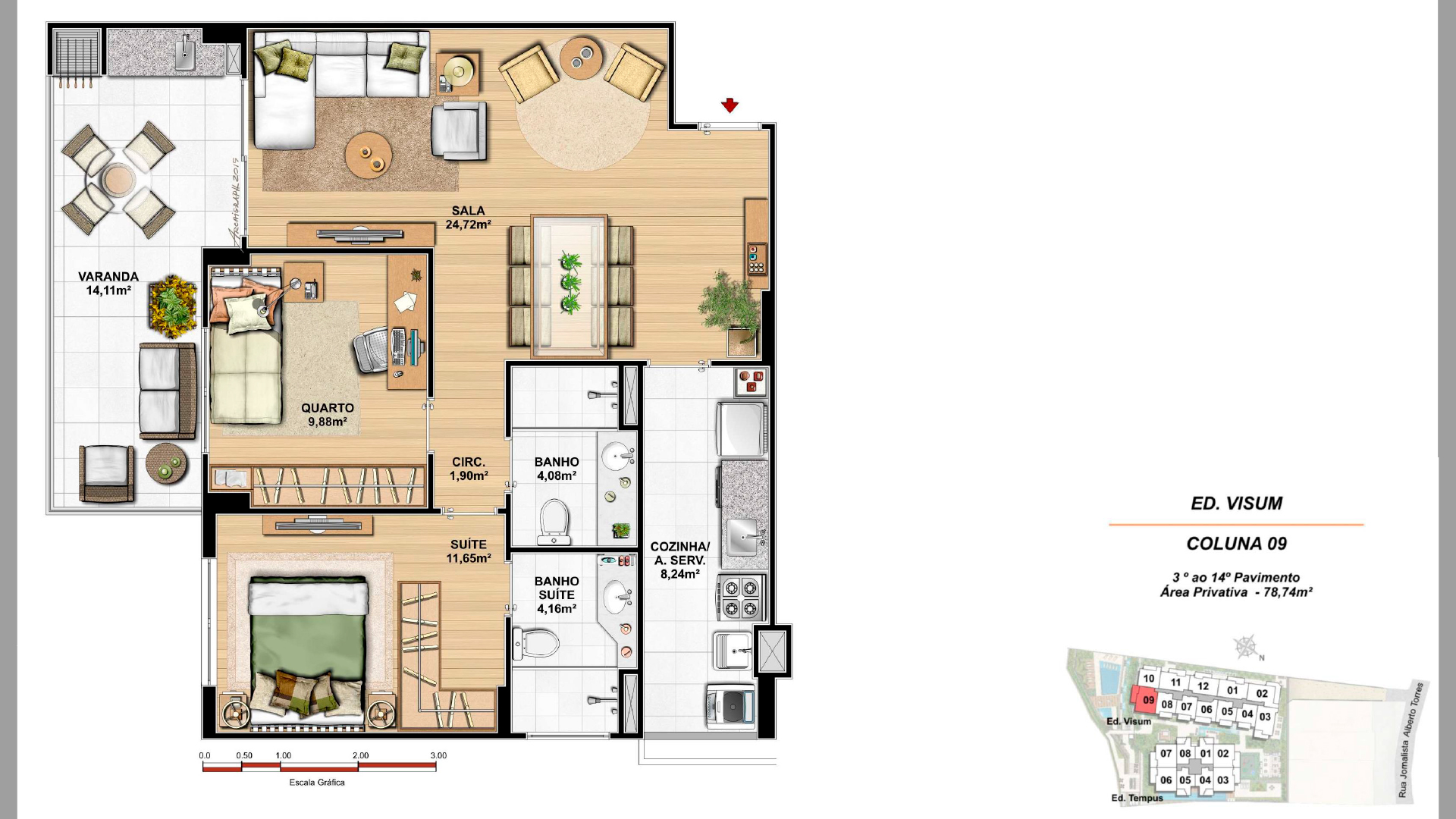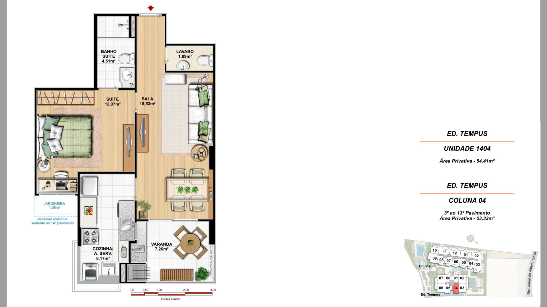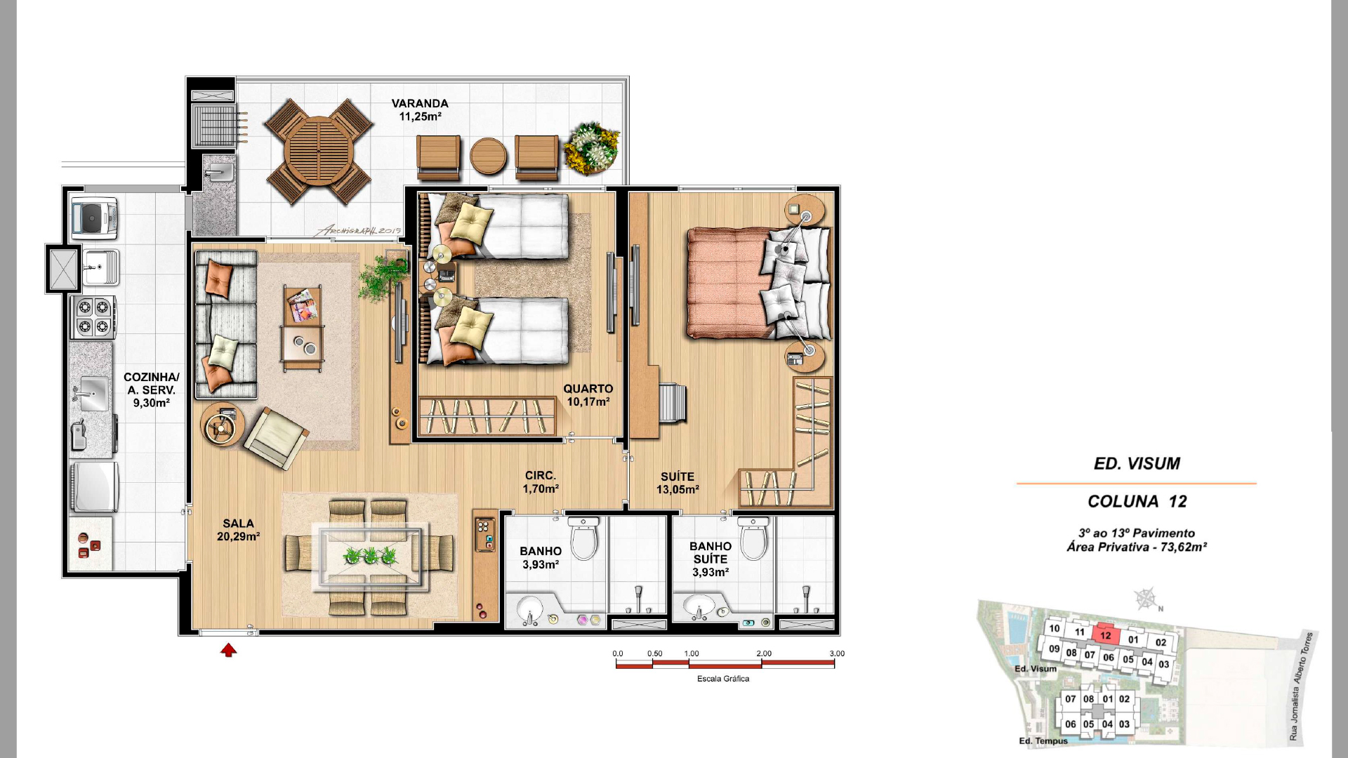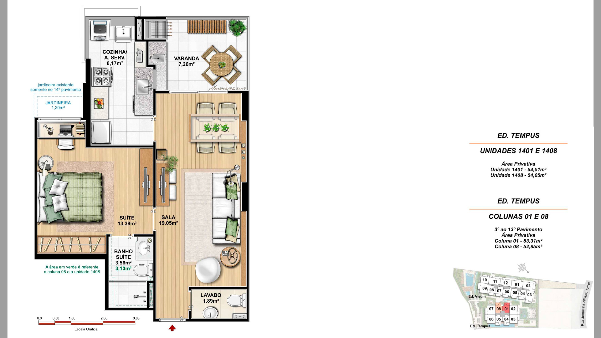 Área do terreno: Mais de 8.500m² • Nº de torres: 2 torres • Nº de pavimentos: 12 tipos, térreo, PUC e Coberturas • Nº de quartos: 2 quartos: 119 (71 Ed. 01 e 48 Ed. 02) 1 quarto: 121 (73 Ed. 01 e 48 Ed.02) Coberturas: 10 de 2 suítes • Nº de vagas: 1 vaga por unidade tipo e 2 vagas para as coberturas • Nº de elevadores: 04 no Ed. 01 02 no Ed. 02.