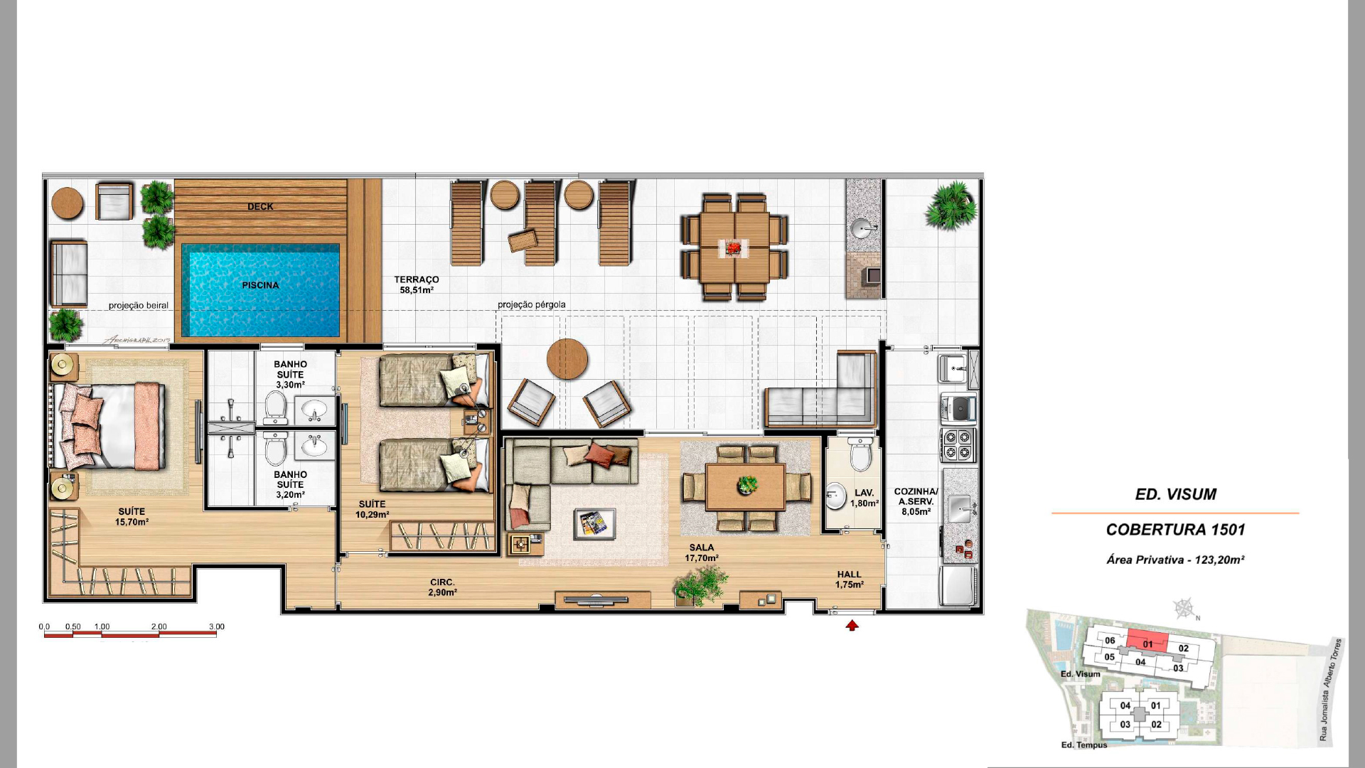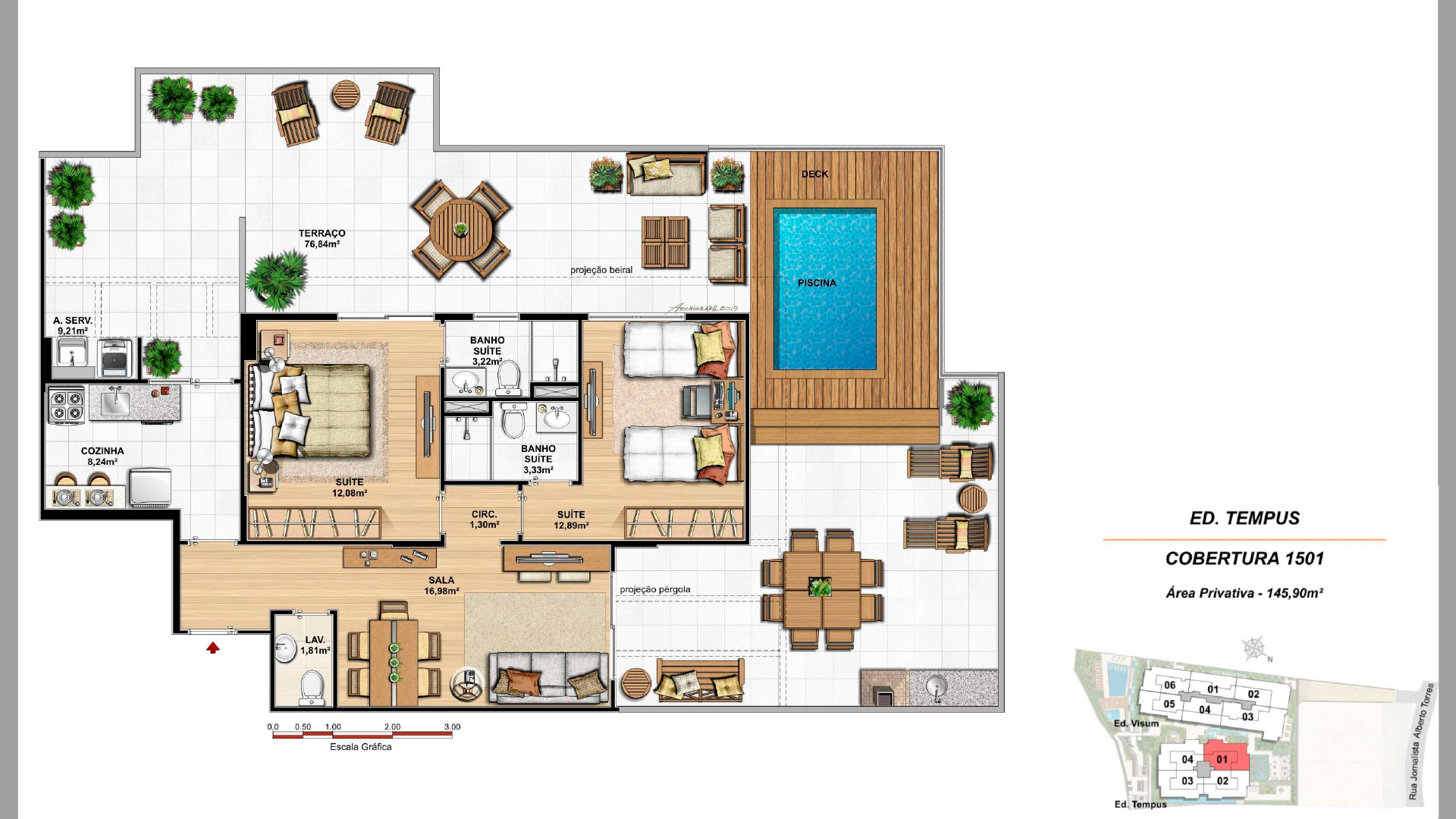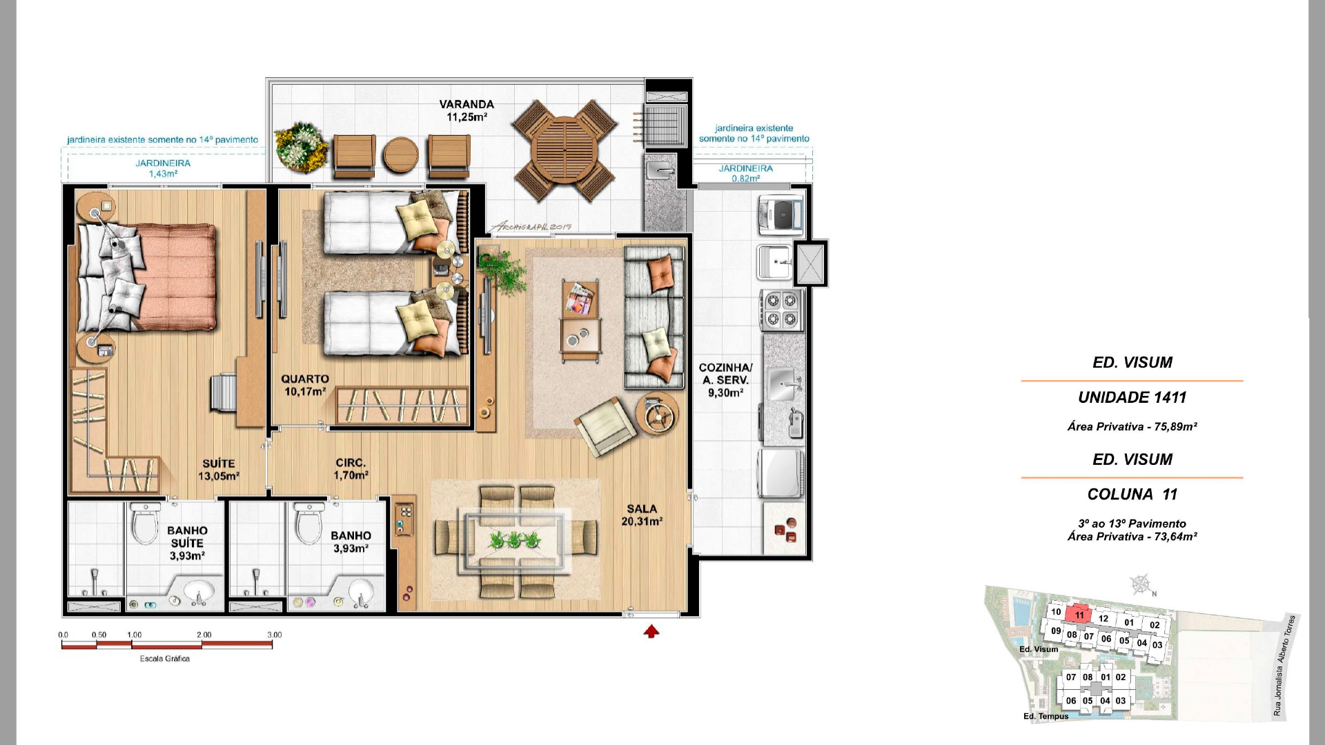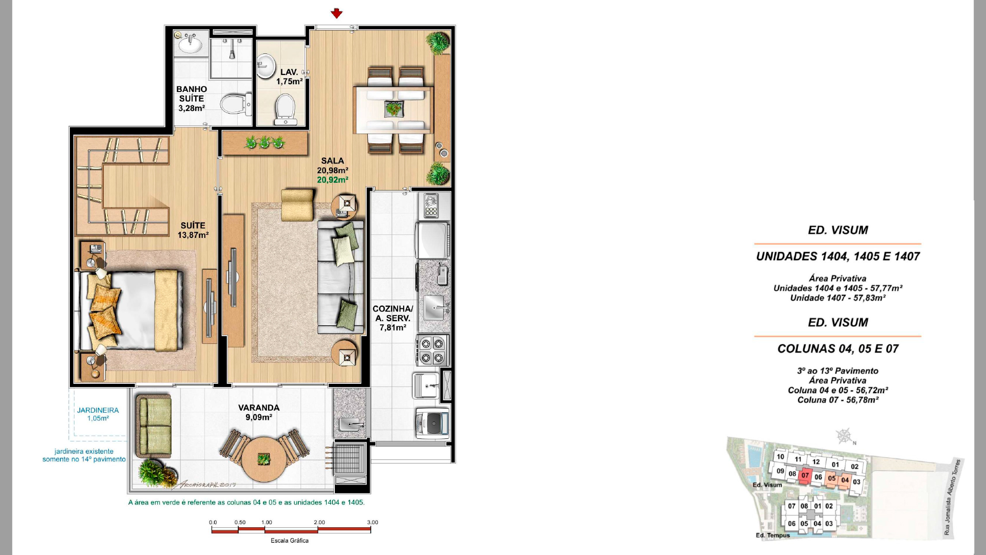 Área do terreno: Mais de 8.500m² • Nº de torres: 2 torres • Nº de pavimentos: 12 tipos, térreo, PUC e Coberturas • Nº de quartos: 2 quartos: 119 (71 Ed. 01 e 48 Ed. 02) 1 quarto: 121 (73 Ed. 01 e 48 Ed.02) Coberturas: 10 de 2 suítes • Nº de vagas: 1 vaga por unidade tipo e 2 vagas para as coberturas • Nº de elevadores: 04 no Ed. 01 02 no Ed. 02.