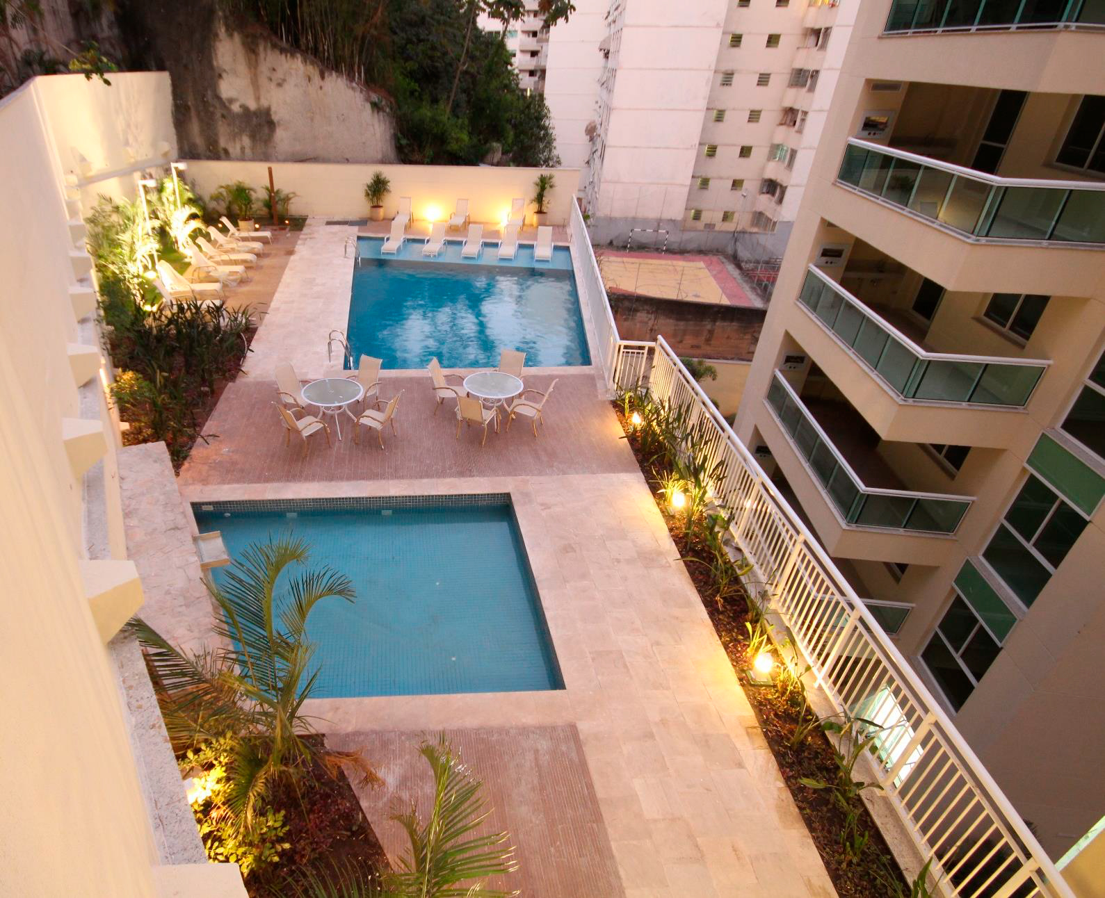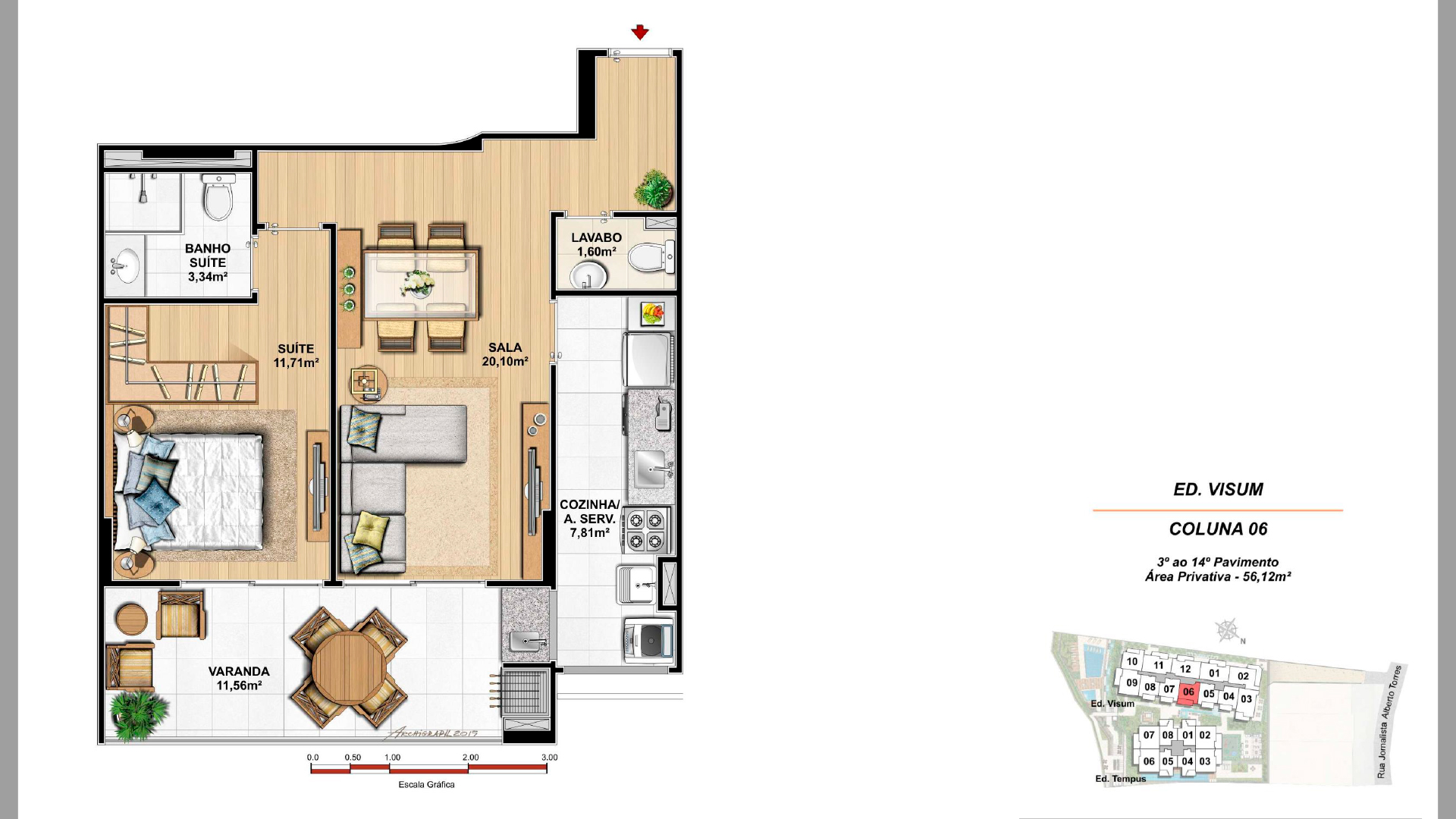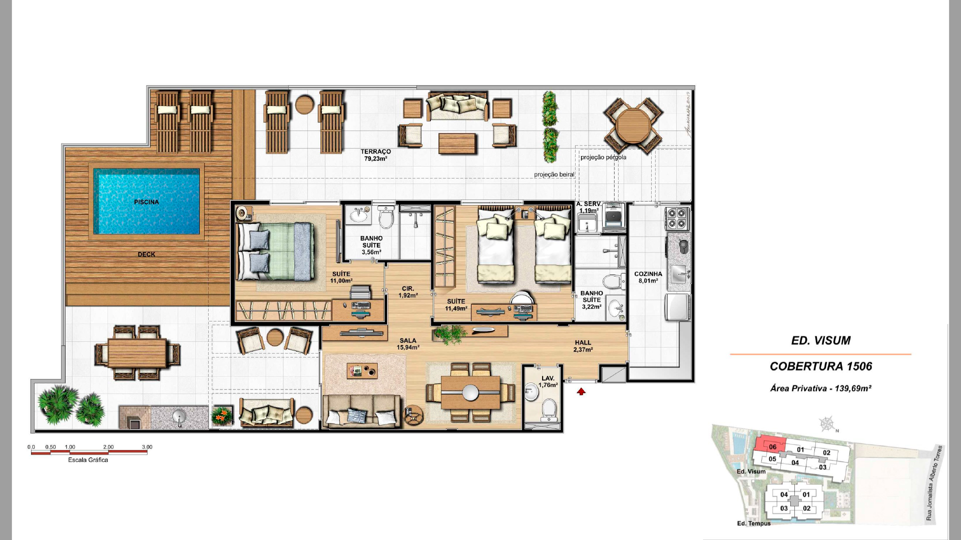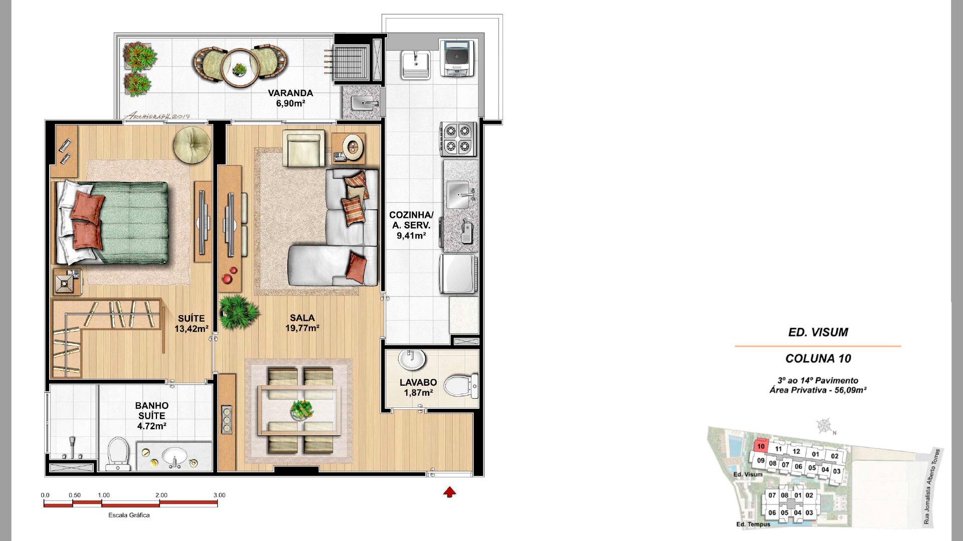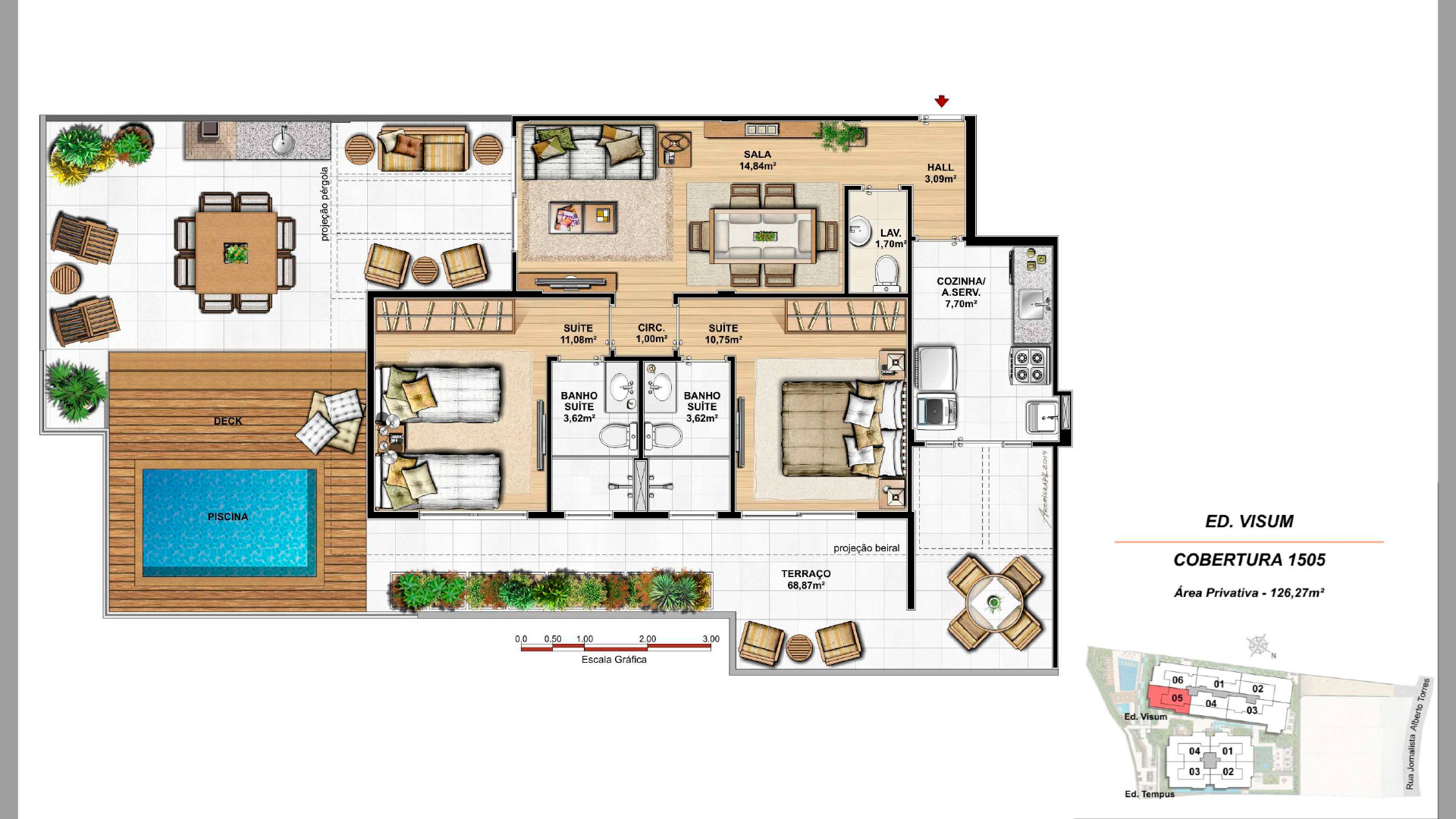 Área do terreno: Mais de 8.500m² • Nº de torres: 2 torres • Nº de pavimentos: 12 tipos, térreo, PUC e Coberturas • Nº de quartos: 2 quartos: 119 (71 Ed. 01 e 48 Ed. 02) 1 quarto: 121 (73 Ed. 01 e 48 Ed.02) Coberturas: 10 de 2 suítes • Nº de vagas: 1 vaga por unidade tipo e 2 vagas para as coberturas • Nº de elevadores: 04 no Ed. 01 02 no Ed. 02.